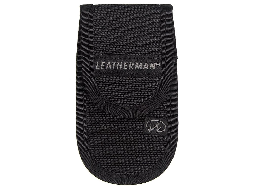 A nylon belt sheath made with sturdy ballistic nylon, featuring a Velcro closure and Leatherman text and logo in grey.